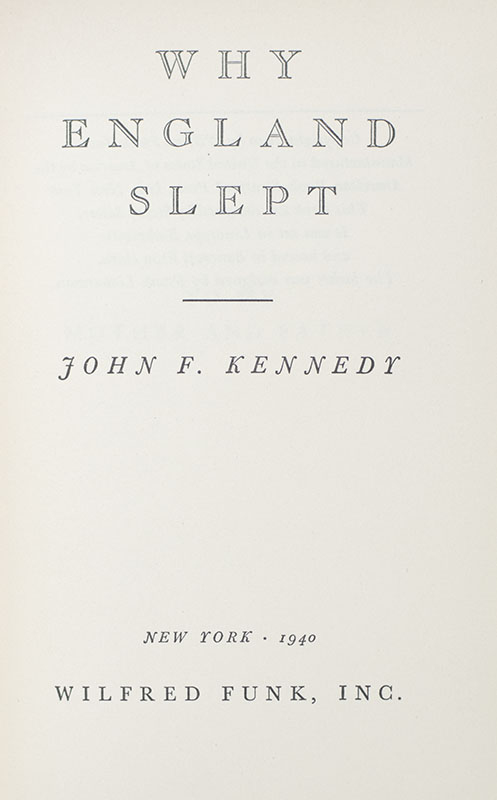 Published the year Kennedy graduated from Harvard, Why England Slept was an expansion of his senior thesis. The title is a variation on the title of Winston Churchill’s work, While England Slept, published about two years before Kennedy’s. It was dedicated to John's parents, Rose and Joe Kennedy. In this work he attempts to explain why England was so poorly prepared for World War II and why England’s leaders settled upon the disastrous policies of appeasement. The book served as a warning to those in our country who felt that appeasing Hitler and staying out of the war was a viable option. It became a bestseller in the United States and went through several printings in its first year. (Newcomb, 10)