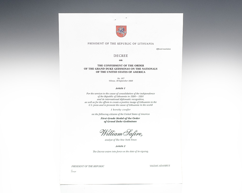 William Safire's First Grade Medal of the Order of Grand Duke Gediminas, awarded by the President of the Republic of Lithuania. Presented with a commemorative certificate and housed in a custom full morocco folder. William Safire was an important American author, columnist, journalist, and presidential speechwriter. He joined Nixon’s campaign for the 1960 Presidential race, and supported him again in 1968. After Nixon’s 1968 victory, Safire served as a speechwriter for him and Spiro Agnew. He authored several political columns in addition to his weekly column “On Language” in The New York Times Magazine from 1979 until the month of his death and authored two books on grammar and linguistics: The New Language of Politics (1968) and what Zimmer called Safire’s “magnum opus,” Safire’s Political Dictionary. Safire later served as a member of the Pulitzer Prize Board from 1995 to 2004 and in 2006 was awarded the Presidential Medal of Freedom by President George W. Bush. In fine condition.
