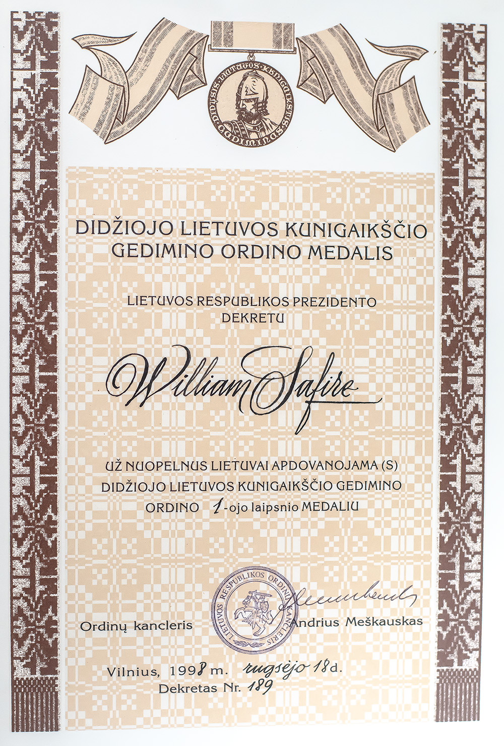 William Safire's Medal of the Order of Grand Duke Gediminas.