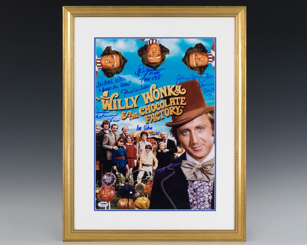 Large photograph of Willy Wonka, the five golden ticket winners and their parents and a trio of Oompa Loompas. Boldly signed by Gene Wilder, Peter Ostrum, Julie Dawn Cole, Denise Nickerson, Paris Themmen, and Michael Bollner, with each but Wilder adding their respective character names from the 1971 film. The photograph measures 17 inches by 12 inches. Double matted and framed. The entire piece measures 22.75 inches by 17.75 inches. An attractive piece.