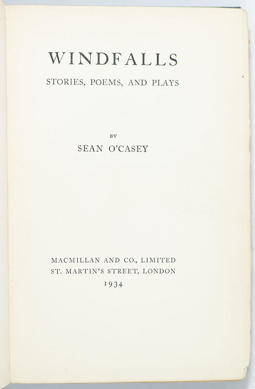 A committed socialist, dramatist Sean O'Casey was the first Irish playwright to write about the Dublin working classes. O'Casey's first accepted play, The Shadow of a Gunman, was performed at the Abbey Theatre in 1923. This was the beginning of a relationship that was to be fruitful for both theatre and dramatist but which ended in some bitterness. Windfalls contains a collection of verses and three short stories written in an effort to release some of the bitterness that swept into O'Casey when the Abbey Theatre rejected his 1927 four-act Expressionist play about the First World War, The Silver Tassie.