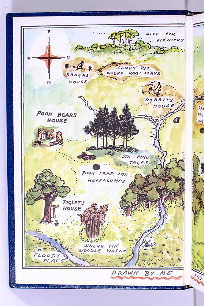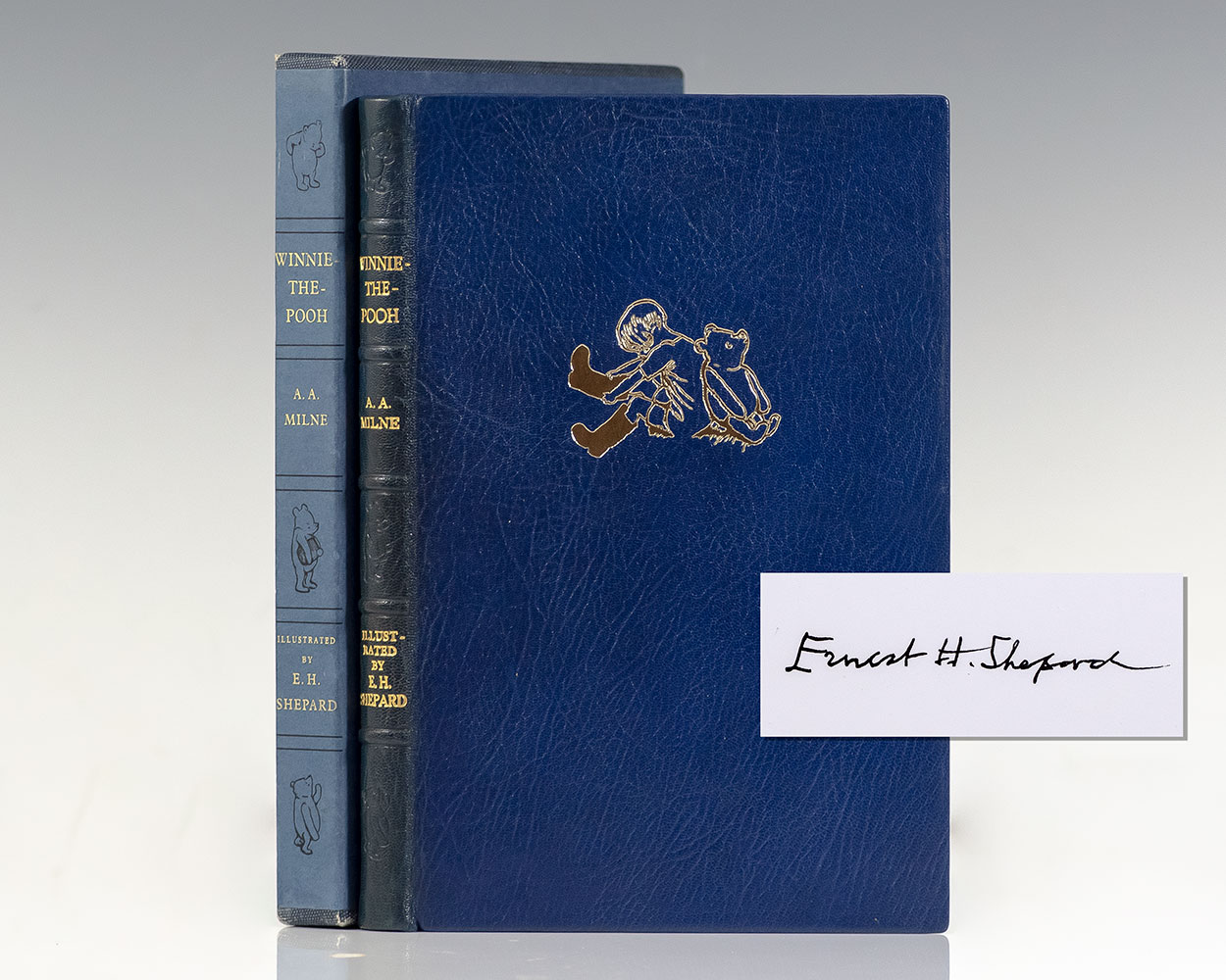 Signed limited edition of this children's classic, one of only 300 signed numbered copies signed by illustrator Ernest H. Shepard, this is number 61. Octavo, original publisher's full morocco with gilt titles to the spine in six compartments within raised bands, gilt vignette of Christopher Robin and Winne the Pooh to the front panel, all edges gilt, cartographic endpapers and color illustrations by Ernest H. Shepard. Signed by Ernest H. Shepard. Fine in a near fine slipcase.