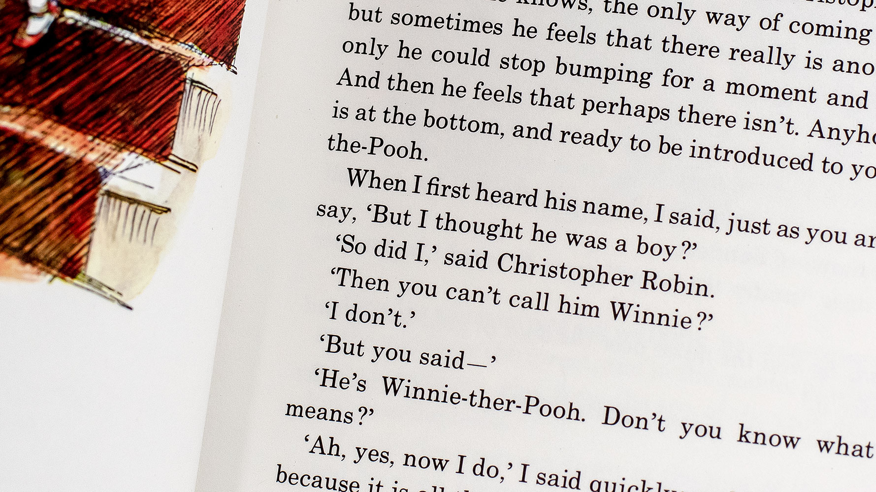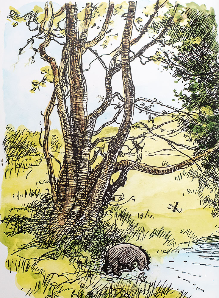 “Milne’s Winnie-the-Pooh has been considered a classic of children’s literature almost since its publication” (Cooper & Cooper). In 1925, A.A. Milne purchased “a Sussex farmhouse for use as a weekend and holiday alternative to the family’s London home… [that would] provide the setting for the stories he now started to write about [his son] Christopher’s toys… Winnie-the-Pooh and The House at Pooh Corner [its companion volume, published 1928] are, on their own terms, more successful as works written for children than anything else produced during children’s literature’s Golden Age” (Carpenter). “Ernest H. Shepard’s illustrations, modeled after the actual toys, show character and movement in simple line vignettes, which add so much to the books that most people consider them to be inseparable from the texts” (Silvey).