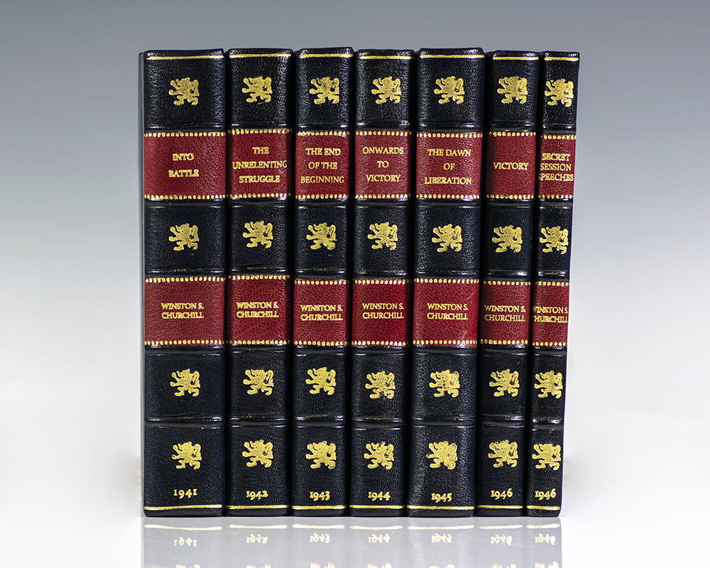 First editions of each volume in Churchill's collected war speeches. Octavo, 7 volumes, bound in three quarters morocco with gilt titles and tooling to the spine, top edge gilt. In fine condition.