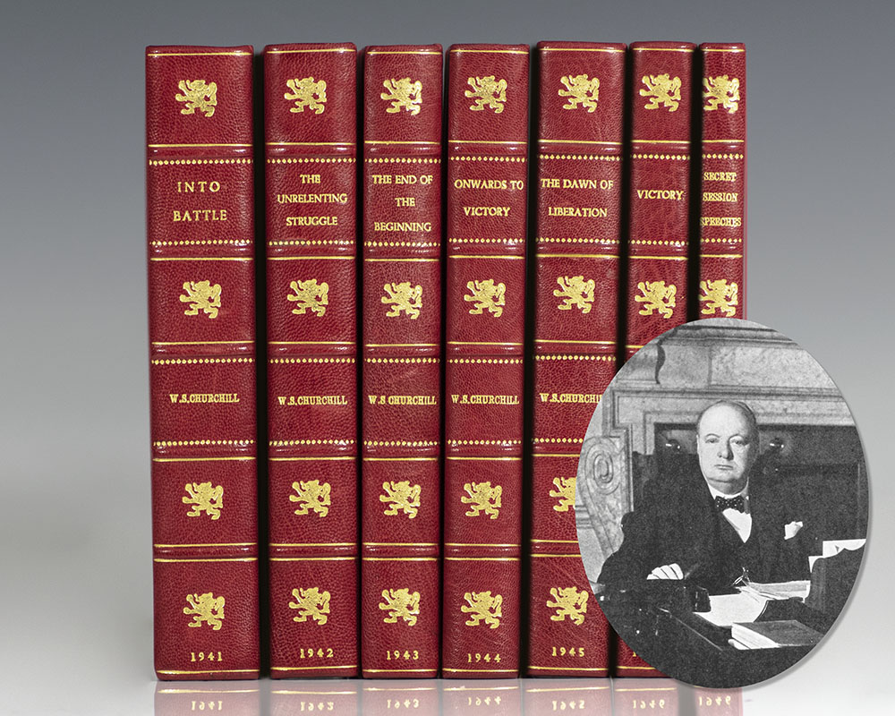 First editions of each volume in Churchill's collected war speeches. Octavo, 6 volumes, bound in three quarter morocco with gilt titles and tooling to the spine, all edges gilt. In fine condition.