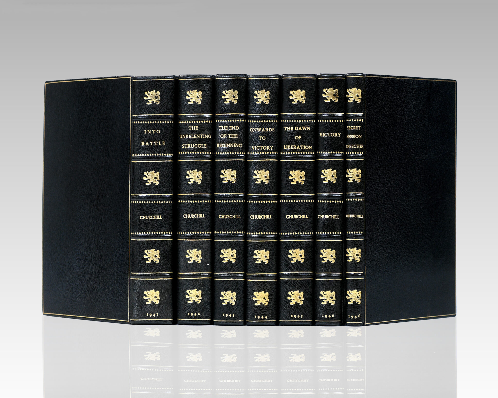 First editions of each volume of Churchill's classic war speeches. Octavo, 7 volumes bound in full crushed morocco with gilt titles and ruling to the spine in six compartments within raised bands, gilt ruled to the front and rear panels, gilt decorated with gilt tooled Churchill lion emblems, top edge gilt, illustrated with 50 half-tone photographic plates, including frontispieces. In fine condition. An exceptional set.