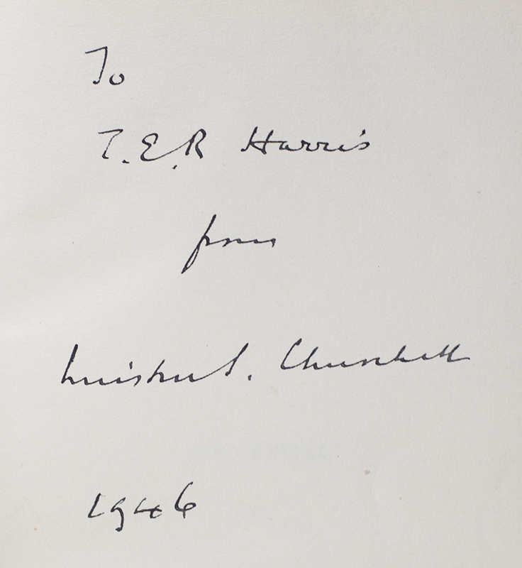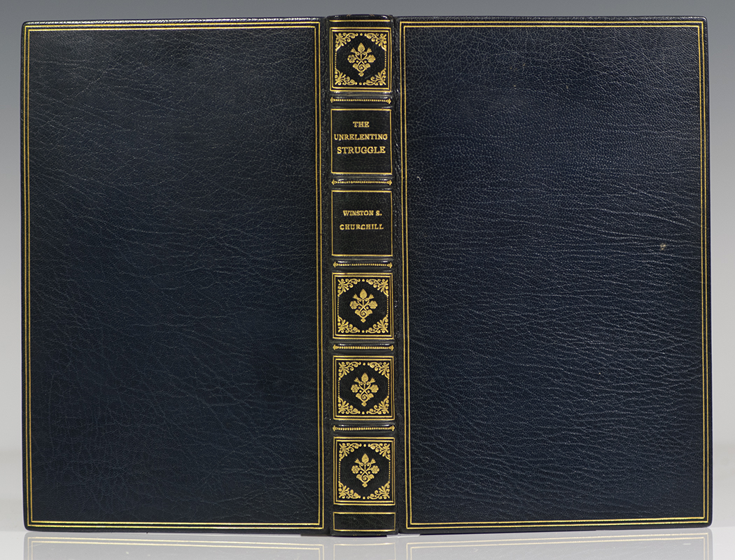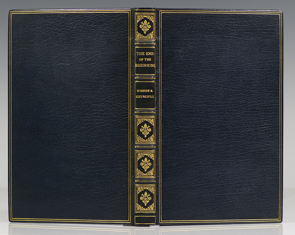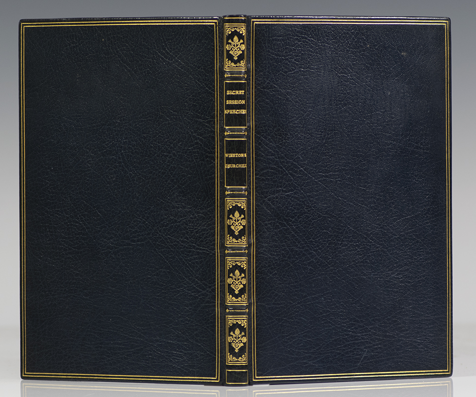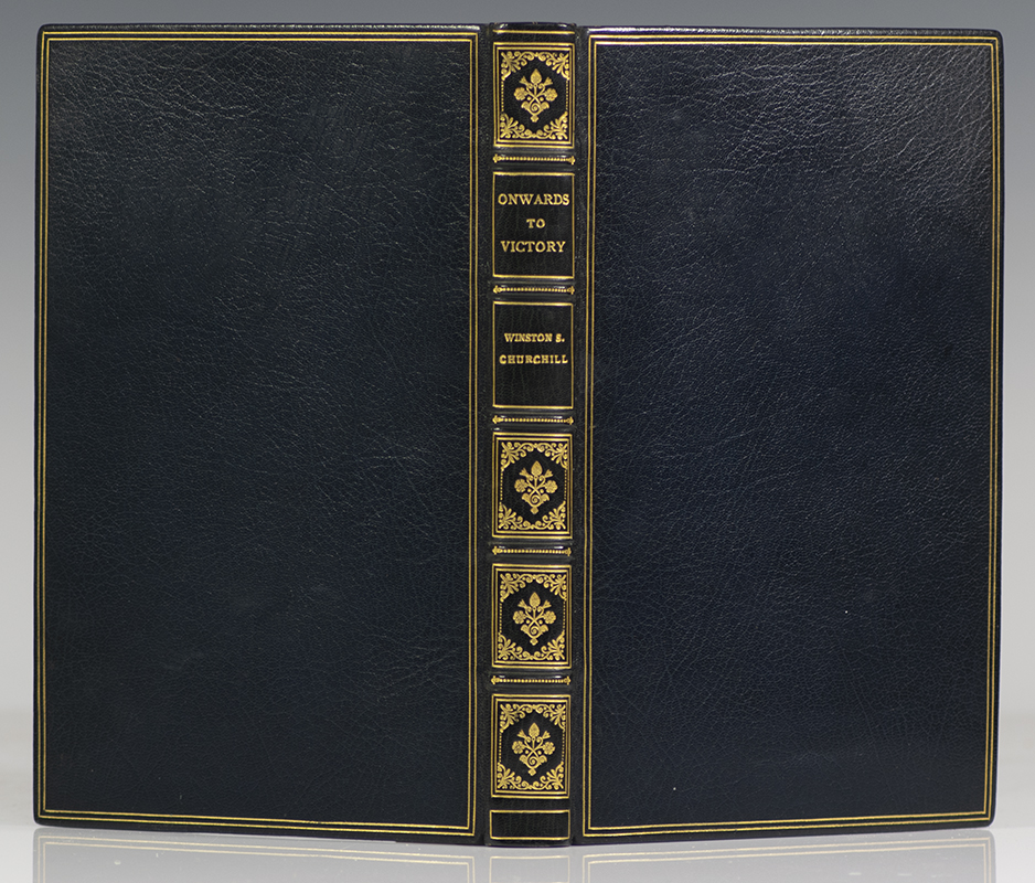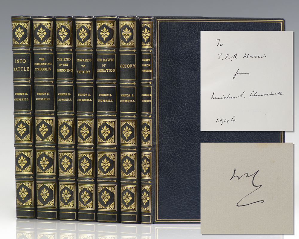 Complete set, mixed editions of Churchill's famed wartime speeches. Octavo, 7 volumes, bound in full crushed dark blue morocco by Sangorski and Sutcliffe, gilt titles and elaborate gilt tooling to the spine in six compartments within raised gilt bands, double gilt ruling to the front and rear panels, gilt turn-ins and inner dentelles, top edge gilt, illustrated with 50 half-tone photographic plates, including frontispieces. Onwards to Victory, The Dawn of Liberation, Victory, and the Secret Session Speeches are first editions. Presentation set, inscribed by Churchill to his bank manager T.E.R. Harris on the flyleaf of Into Battle, "To T.E.R. Harris from Winston S. Churchill 1946" and initialized by Churchill on the flyleaf of the remaining 6 volumes. The recipient, T.E.R. Harris was Churchill’s financial adviser at the Pall Mall branch of Lloyds bank in London from 1943 to 1948. For many years Churchill relied heavily on his press articles and book deals to assuage his financial worries and often turned to Harris for advice. One of these occasions was in 1943, when Churchill was negotiating the film rights to Marlborough with Sir Alexander Korda and MGM. As the bidding was being pushed up, he sought tax advice from Lloyds and Harris was consulted. Harris happened to be acquainted with famed film producer Filippo Del Giudice, who finally secured the rights to the film for a staggering £50,000. Although Marlborough was ultimately never produced, the deal completely changed Churchill’s finances and allowed him to open negotiations to buy back the rights to the History of the English-Speaking Peoples. In fine condition. An exceptional presentation set, we have never seen a complete signed set.