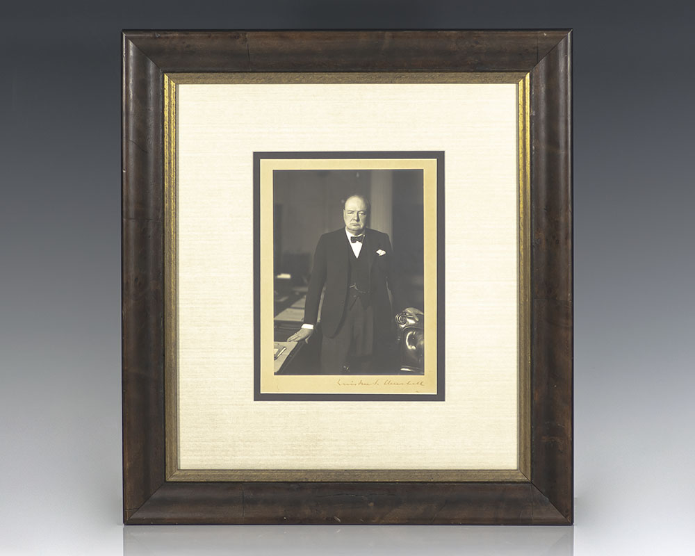 Portrait of Churchill by Walter Stoneman, showing him with his hand on a desk and the other on a chairback, boldly signed "Winston S. Churchill." Stoneman studio stamp on the verso of the mount. Double matted and framed. The entire piece measures 20 inches by 16.5 inches. A very nice presentation.