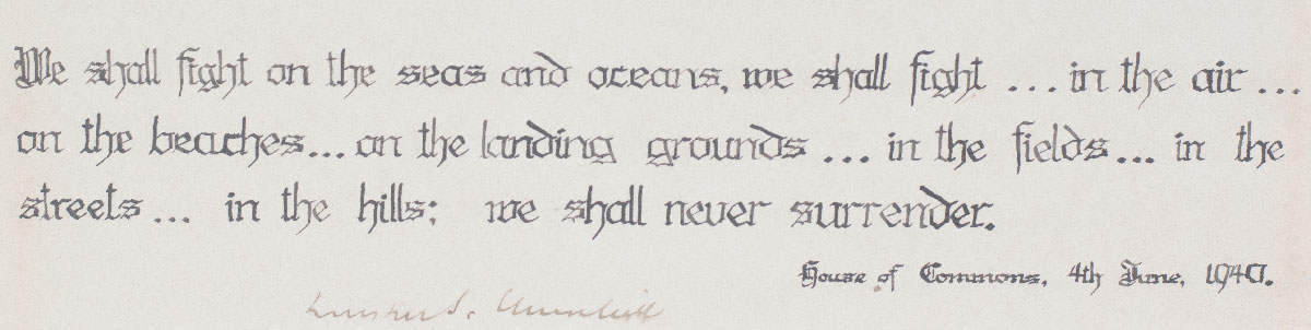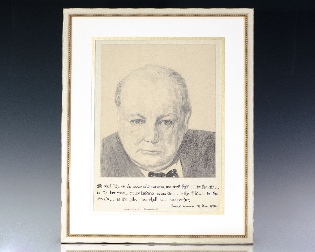 Original portrait of Winston Churchill by Sylvia Arnold, boldly signed by him, "Winston Churchill" and with quotation from his 4 June 1940 speech in ink below, "We shall fight on the seas and oceans, we shall fight...in the air...on the beaches...on the lading grounds...in the fields...in the streets...in the hills: we shall never surrender." Also signed by the artist, "Sylvia Arnold 1940." Sylvia Arnold joined the office of Lord Hastings Ismay, Churchill's chief military advisor, as a teenager in 1938, and worked in the Cabinet War Office from 1938 to 1947. She travelled with Ismay to Yalta in 1945 and on the RMS Queen Mary with Churchill to America. Another sketch of Churchill, together with her collection of wartime letters, photographs and memorabilia was included in the Sylvia Arnold and the Role of Women in World War Two exhibition at the Jewish Military Museum, Hendon, in 2013. Double matted and framed. The entire piece measures 21.5 inches by 17.5 inches.