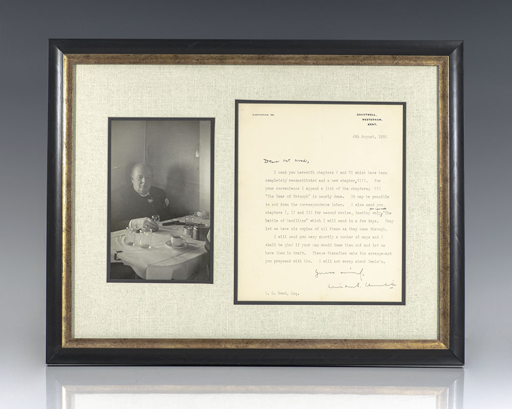 One page typed letter signed by Winston S. Churchill, on this Chartwell letter dated, August 6, 1935. The letter to his proofreader and editor C. C. Wood relating to the publication of the monumental biography Marlborough: His Life and Times. It reads in full, "I send you herewith chapters V and VI which have been completely reconstituted and a new chapter, VIII. For your convenience I append a list of the chapters; VII 'The Year of Triumph' is nearly done. It may be possible to cut down the correspondence later. I also send you chapters I, II and III for second revise, leaving only for revise 'The Battle of Ramillies' which I will send in a few days. Pray let me have six copies of all these as they come through. I will send you very shortly a number of maps and I shall be glad if your man would draw them out and let me have them in draft. Please therefore make the arrangement you proposed with him. I will not worry about Swain's." Churchill was commissioned to write a biography of his ancestor, John Churchill, 1st Duke of Marlborough, in 1929. He began writing it in earnest in 1932, and ultimately published four volumes between 1933 and 1938. He began the work in an effort to refute earlier criticisms of Marlborough by the historian Thomas Babington Macaulay. This exquisite letter reveals Churchill’s meticulousness and attention to detail as a writer, which would ultimately lead to his receipt of the 1953 Nobel Prize in Literature for "his mastery of historical and biographical description as well as for brilliant oratory in defending exalted human values." Double matted and framed with an original photograph of Churchill. The entire piece measures 19.25 by 15.25 inches. In fine condition.