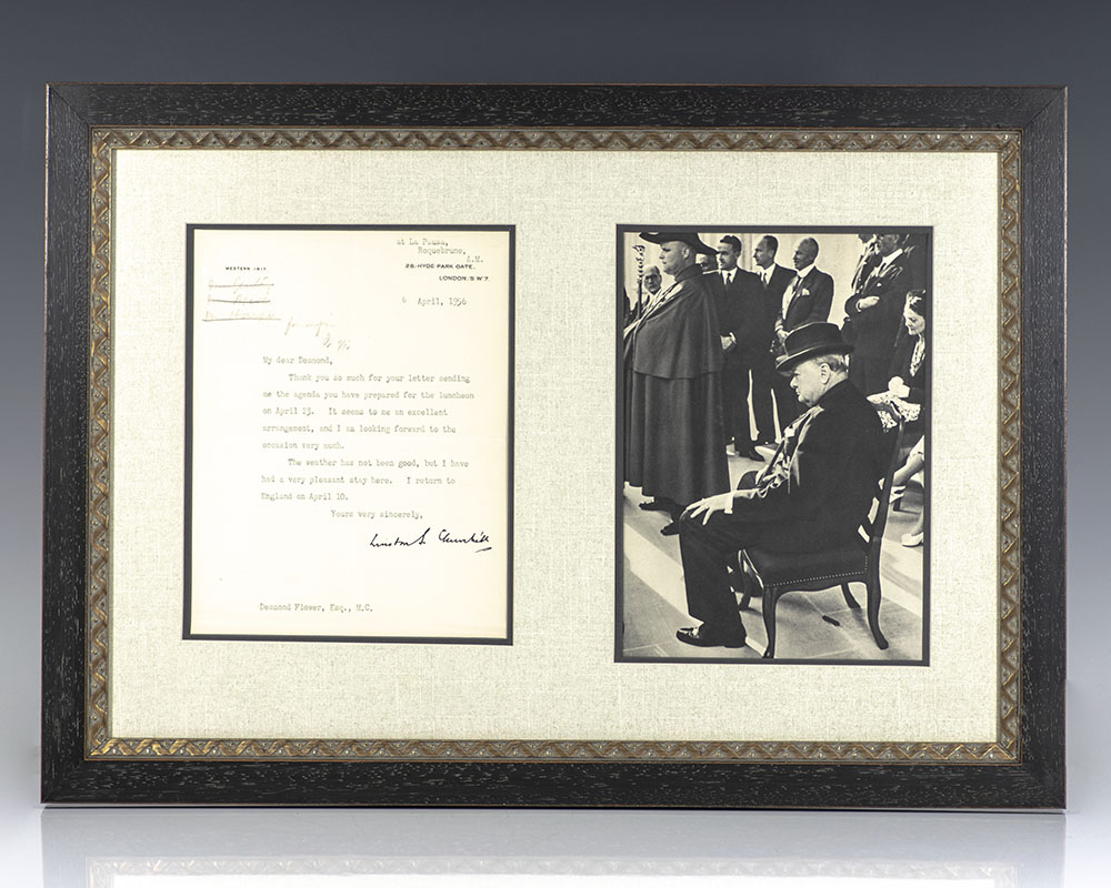 One page typed letter signed by Winston S. Churchill, dated April 6, 1956, on his "28 Hyde Park Gate, London" letterhead stationery. The letter is to author and publisher Desmond Flower and reads, "Thank you so much for your letter sending me the agenda you have prepared for the luncheon on April 23. It seems to me an excellent arrangement, and I am looking forward to the occasion very much. The weather has not been good, but I have had a very pleasant stay here. I return to England on April 10." The letterhead has been amended to read: "at La Pausa, Roquebrune, A.M. Winston S. Churchill." The recipient, Desmond Flower, published Churchill's The History of the English Speaking Peoples. Double matted and framed with a portrait of Churchill. The entire piece measures 23 inches by 16.25 inches. In near fine condition.