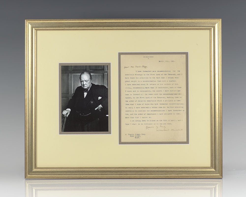 One page typescript letter signed by Winston S. Churchill while serving as a member of Parliament. On 105 Mount Street stationary dated March 15th, 1901 and addressed to J. Travis Clegg, Esq. Shaw Lodge, Shaw. "Dear Mr. Travis Clegg," I have forwarded your recommendation for the Leesfield Vicarage to the First Lord of the Treasury, and I have drawn his attention to the fact that I attach very great weight to a recommendation from such a quarter. I have received about 30 letters on the subject of this living, recommending more than 12 candidates, none of whom I know; and in consequence, the course I have pursued has been to forward all the names with the recommendations attached, to the First Lord of the Treasury, marking them in the order of relative importance which I assigned to them from what I know of those who have forwarded recommendations. In reply I have received a letter from Mr. Balfour promising carefully to consider the recommendations I have forwarded to him, and the order of importance I have assigned to them. More than that I cannot do. I am coming down to Oldham on the 20th of April, and I hope I shall be so fortunate as to see you then. "Yours very truly, Winston S. Churchill." Churchill took seat in the British House of Commons in February of 1901 and was soon asked by Prime Minister Arthur Balfour to join a parliamentary select committee on the topic of the Boer War. Churchill opposed an increase in military funding for the war and became increasingly associated with the Liberals including H.H. Asquith. The present letter is in response to English lawyer J. Travis Clegg's recommendation for the Leesfield Vicarage to the First Lord of the Treasury. Double matted and framed with a black and white photograph of Churchill. The entire piece measures 20.25 inches by 16.5 inches.