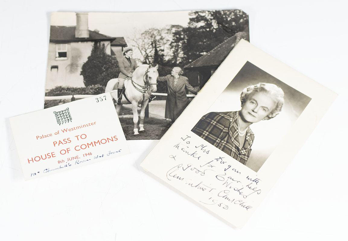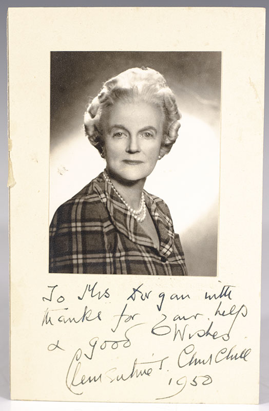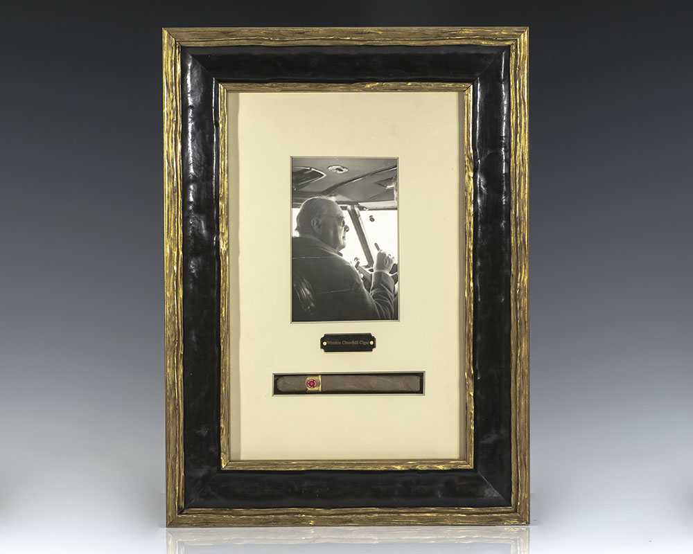 Exceedingly rare unsmoked La Aroma De Cuba cigar presented by Winston S. Churchill to the Churchill family governess, Mary Dorgan, the Irishwoman who provided domestic help to the Churchill family through the 1940s and into the 1950s. Framed with an original photograph of Winston S. Churchill smoking another of his favorite La Aroma De Cuba cigars. Accompanied by a rare original photograph of Churchill's wife, Clementine, inscribed on the mount to Mary Dorgan, ‘To Mrs. Dorgan with thanks for your help and good wishes Clementine Churchill 1950", a pass to the Churchill's room in the Palace of Westminster House of Commons also from Dorgan's collection, and a photograph of Dorgan with Winston and Clementine's daughter, Sarah. Winston S. Churchill and Clementine Hozier met at a dinner party in 1908 and after only a few months of correspondence, Winston wrote to Clementine’s mother, Lady Blanche Hozier, requesting consent for their marriage. On September 12th 1908, the two were wed at St. Margaret’s, Westminster, he more than a decade older than she and already a seasoned Parliamentarian. The Churchills had five children: Diana, Randolph, Sarah, Marigold, and Mary and their marriage was close and affectionate despite the stresses of public life throughout Churchill’s political career. In fine condition. Matted and framed, the entire piece measures 22.5 inches by 16.25 inches. Exceedingly rare with exceptional provenance.