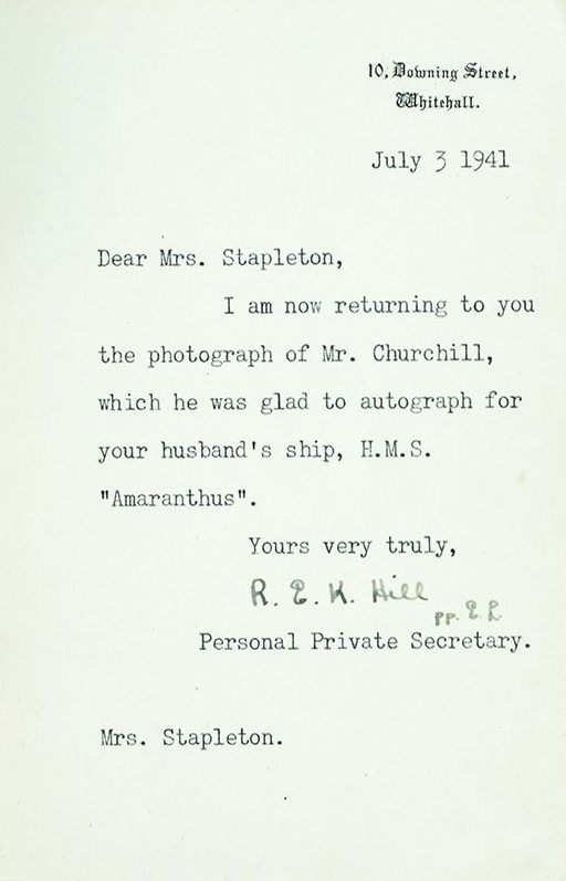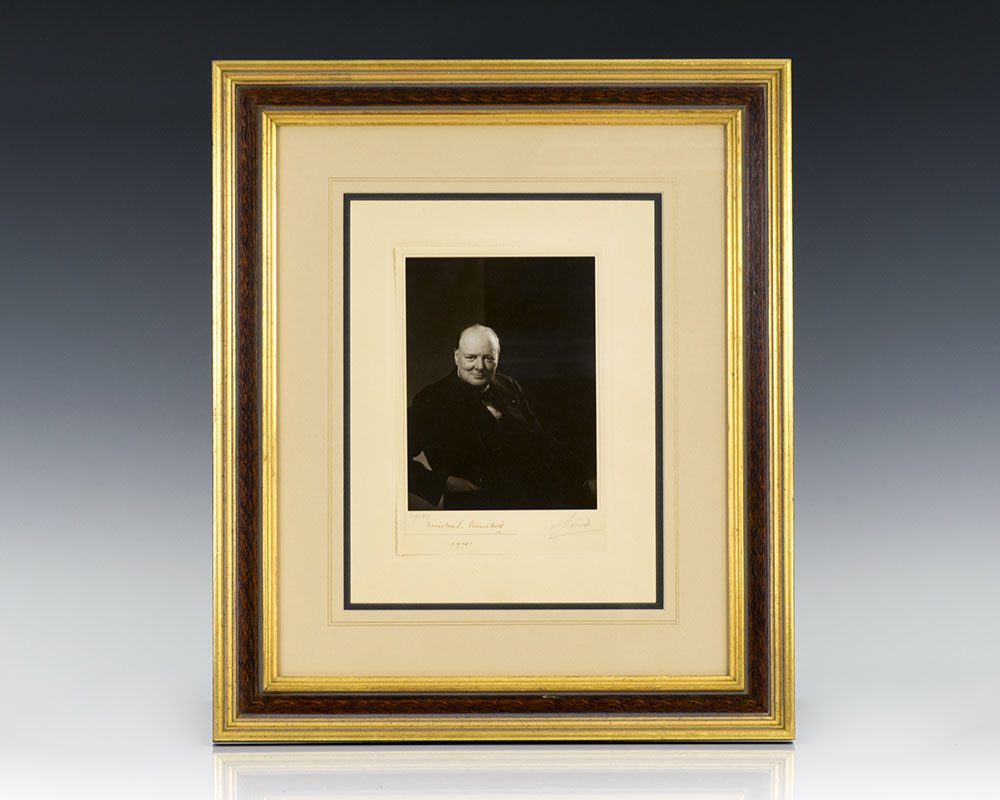 Signed photograph of Prime Minister Winston Churchill with his right hand in his pocket. Boldly signed, "Winston S. Churchill, 1941", affixed to its original studio mount. Accompanied by a letter from Churchill's personal secretary R. E. K. Hill, dated July 3, 1941, addressed Mrs. Stapleton, "I am now returning to you the photograph of Mr. Churchill, which he was glad to autograph for your husband's ship, H.M.S. 'Amaranthus.' Nicholas Stapleton commanded HMS Amaranthus from January to August 1941. American photographer Edward Steichen took this photo of Churchill in 1932 for Vanity Fair magazine, with the image later serving as the dust jacket photograph for While England Slept in 1938, the American edition of Churchill's Arms and the Covenant. Authorized copies of this print were produced for sale by Harrods after Churchill ascended to the Prime Ministership in 1940. The photograph measures 5.75 inches by 7.75 inches. Double matted and framed. The entire piece measures 18 inches by 21 inches. An exceptional signed portrait with noted provenance.