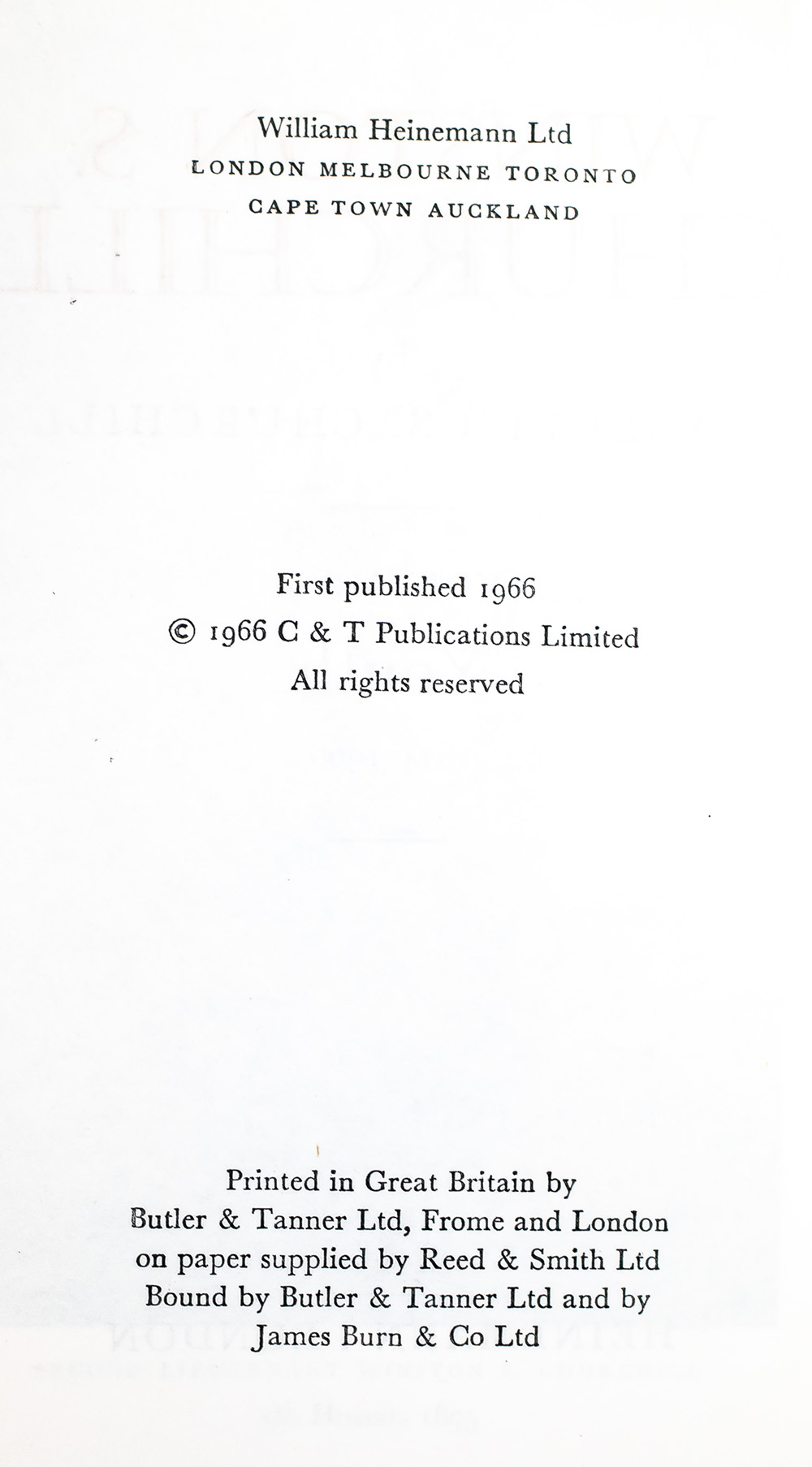 First edition of the first installment in Randolph S. Churchill's official biography of his father, Winston S. Churchill; complete with first editions of both parts of its companion volume. Octavo, 3 volumes, original publisher's cloth, top edges red, illustrated with photographs, frontispiece portrait of Winston S. Churchill as second lieutenant, 4th Hussars, 1895. Each volume is near fine in a fine dust jacket. Tape remnants to the front and rear endpapers. Jacket design by Tom Simmonds.