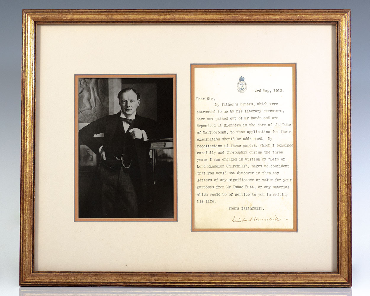 Rare typed letter signed by Winston Churchill as First Lord of the Admiralty. One page, on Churchill's Admiralty Whitehall letterhead the letter reads in full, "3rd May, 1913. Dear Sir, My father's papers, which were entrusted to me by his literary executors, have now passed out of my hands and are deposited at Blenheim in the care of the Duke of Marlborough, to whom application for their examination should be addressed. My recollection of these papers, which I examined carefully and thoroughly during the three years I was engaged in writing my "Life of Lord Randolph Churchill", makes me confident that you would not discover in them any letters of significance or value for your purposes from Mr Isaac Butt, or any material which would be of service to you in writing his life. Yours faithfully, "Winston S. Churchill." In very good condition. Double matted and framed with a portrait of a young Churchill. The entire piece measures 15 inches by 12.5 inches.
