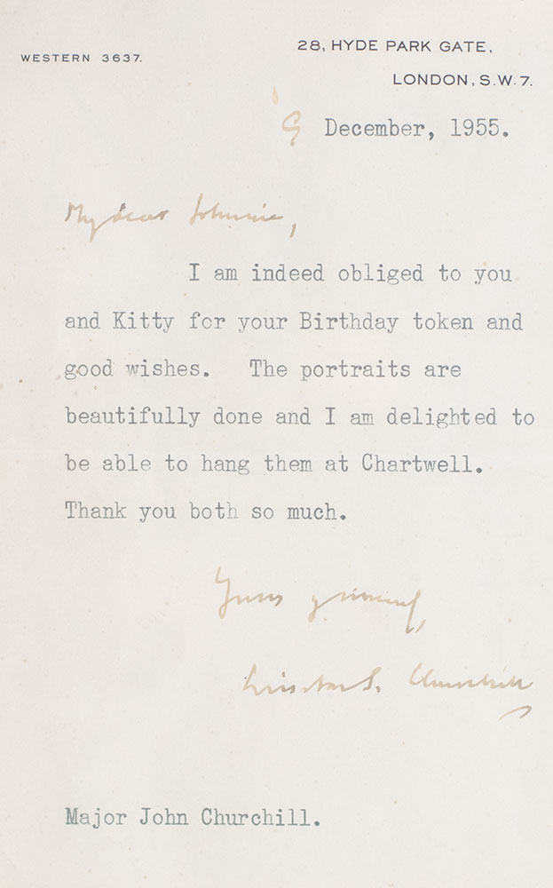 Rare typed letter signed by Winston S. Churchill to his brother and only sibling, Major John Churchill, framed with an original duotone print of Yousuf Karsh's famed portrait of Churchill “The Roaring Lion” which, in May 1941, was featured on the cover of Life magazine and brought Karsh international fame. One page, on Churchill's 21 Hyde Park Gate, London letterhead, the letter is addressed to Major John Churchill and reads in full, "9" December, 1955. "My dear Johnnie," I am indeed obliged to you and Kitty for your birthday token and good wishes. The portraits are beautifully done and I am delighted to be able to hang them in Chartwell. Thank you both so much. "Yours sincerely, Winston S. Churchill." John Strange Spencer-Churchill, known as Jack Churchill, was the younger son of Lord Randolph Churchill and his wife Jennie, and Winston Churchill's only sibling. He served in the South African Light Horse alongside Winston in the Second Boer War in 1899–1900 and later fought in World War I. After the war, he became a businessman in the City of London firstly as a partner at stockbrokers Nelke, Phillips & Bendix from 1906 and then at Vickers, da Costa, making partner in 1921. In fine condition. Double matted and framed with an original duotone print of Yousuf Karsh's famed portrait of Churchill taken in 1941. The portrait measures 9 inches by 10.5 inches. The entire piece measures 15 inches by 20 inches. Rare and desirable.