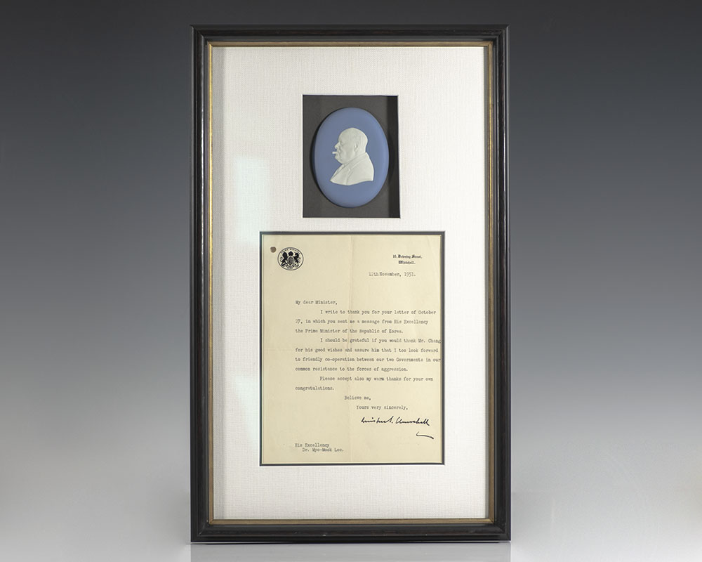 Rare typed letter signed by Winston S. Churchill as Prime Minster of the United Kingdom. One page on Churchill's 10 Downing Street letter head with the seal of the British Prime Minister, the leader reads: 12th November, 1951 His Excellency Dr. Myo-Mook Lee. My dear Minister, I write to thank you for your letter of October 27, in which you sent me a message from His Excellency the Prime Minister of the Republic of Korea. I should be grateful if you would thank Mr. Chang for his good wishes and assure him that I too look forward to friendly co-operation between our two Governments in our common resistance to the forces of aggression. Please accept also my warm thanks for your own congratulations. Believe me, Yours very sincerely "Winston S. Churchill." Written less than six months after the start of the Korean War on June 25th 1950, this significant letter illustrates Churchill's resolute commitment to the containment of the Communist threat. When the North Korean military first invaded South Korea, it was Churchill who stood in the House of Commons to deliver the Conservative Party's support to the government to deploy troops to the Korean peninsula and fight what he viewed as unprovoked aggression on the part of the North. In fine condition. Double matted and framed with a bas relief portrait plaque by Wedgewood of Churchill in profile with a cigar. The entire piece measures 21 inches by 12.5 inches.