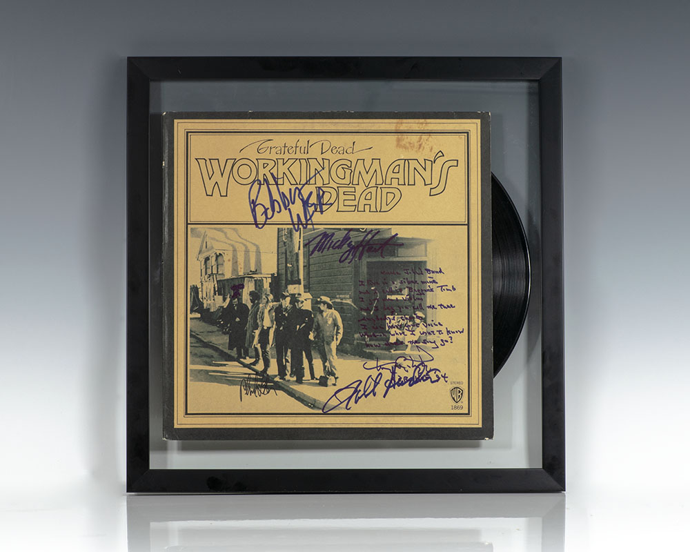 Original LP of Workingman's Dead boldly signed by Bob Weir, Phil Lesh, Mickey Hart, Robert Hunter and Tom Constanten who has written out the lyrics to the classic song Uncle John's Band, which reads, "I live in a silver mine and I call it beggar's tomb; I got me a violin and I beg you call the tune." In near fine condition.