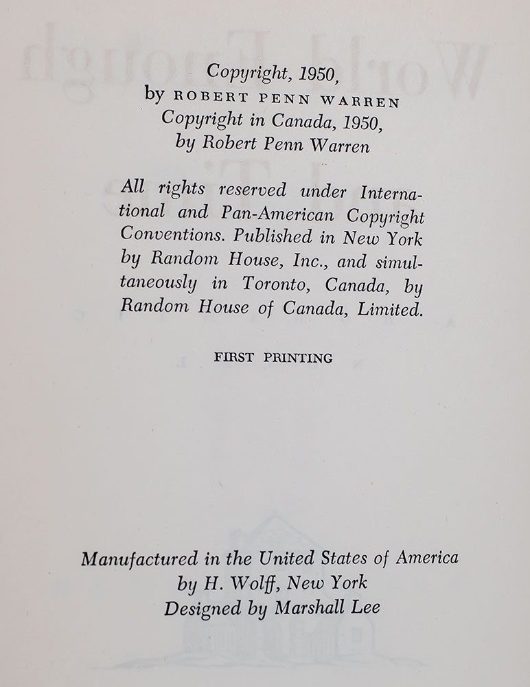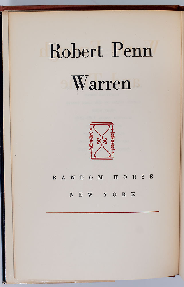 First edition of this classic novel; one of the big sleepers in 20th century American fiction and the "richest of [Warren's] novels" (New York Herald Tribune). Octavo, original cloth. Signed by Robert Penn Warren with a full page inscription on the front free endpaper. Near fine in a very good dust jacket. Jacket design by Jules Gottlieb. A unique example.