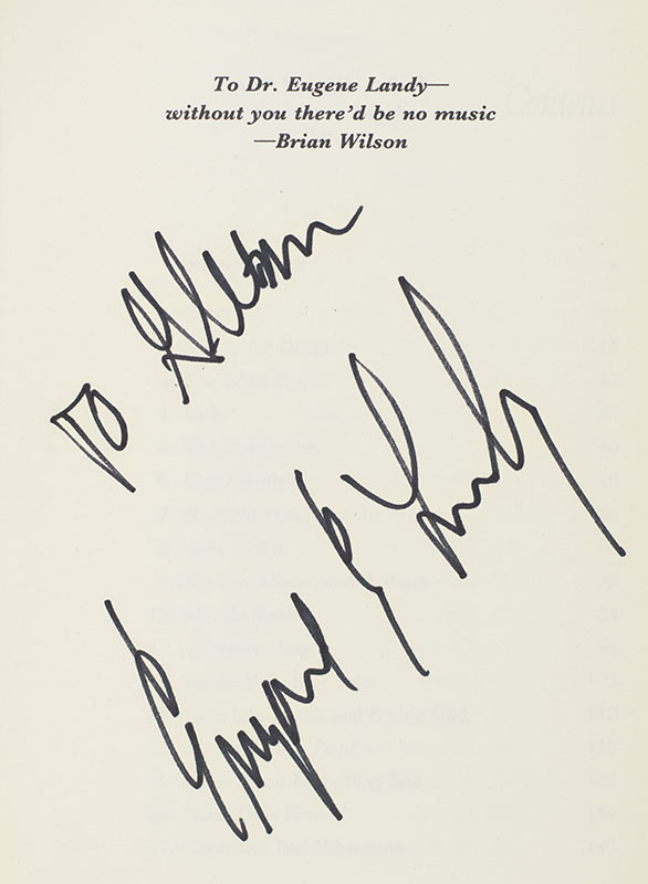First edition of Brian Wilson's candid autobiography. Octavo, original half cloth. Presentation copy, inscribed by Brian Wilson on the half-title page, "To Glen Brian Wilson", signed by Todd Gold on the title page and inscribed by Dr. Eugene Landy on the dedication page, "To Glenn Eugene E. Landy." The recipient, Glenn Goldman founded Book Soup in 1975, an independently owned bookstore on Sunset Strip in West Hollywood specializing in art, music, film, photography, design and fiction. American psychotherapist Dr. Eugene E. Landy was best known for his unconventional psychological treatments, especially for his treatment of Wilson in the 1970s and 80s in which he essentially took control of his life, monitoring him 24 hours a day with a team of assistants to keep him sober. The treatment was later deemed unethical by Californian courts and was later dramatized in the 2014 biographical film Love & Mercy, in which Landy is portrayed by Paul Giamatti. Wilson dedicated the present volume to Landy. Fine in a fine dust jacket. Jacket design by Suzanne Noli. Jacket photograph by Mark Hanauer. A unique example.