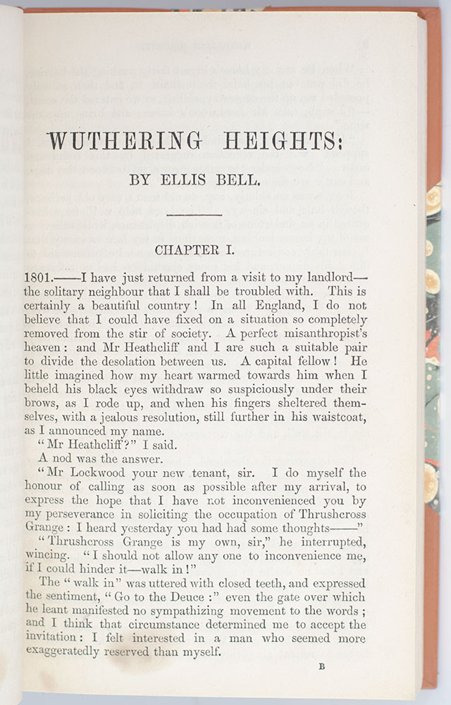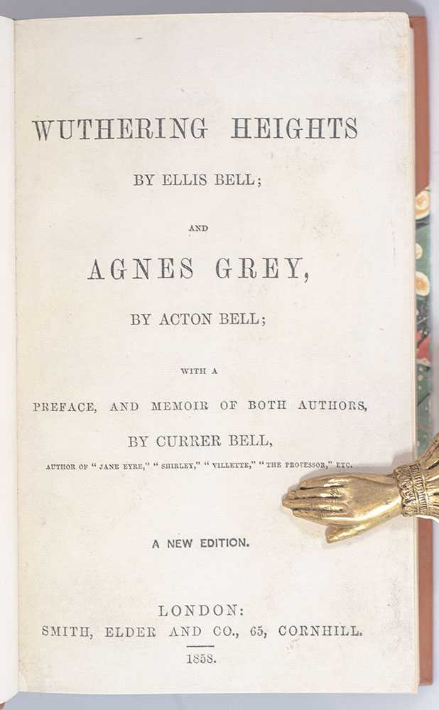Finely bound example of both Emily and Anne Brontë's singular masterpieces, originally published under the pseudonyms Ellis and Acton Bell. Octavo, bound in three quarters calf over marbled boards by Bayntun-Riviere, morocco spine labels, raised bands, marbled endpapers, top edge gilt, with the original advertisement endpapers, original cloth covers and spine bound in at rear. Edited and compiled by Charlotte Brontë under the pseudonym Currer Bell with her Editor's Preface, Biographical Notice of the Authors, and Selections from the Literary Remains of Ellis and Acton Bell. Charlotte was the driving force behind the publication of all three sisters' works and survived both Emily (who died at the age of 30 in 1848, a year after the initial publication of Wuthering Heights) and Anne (who died at the age of 29 in 1849). In near fine condition. An exceptional example.