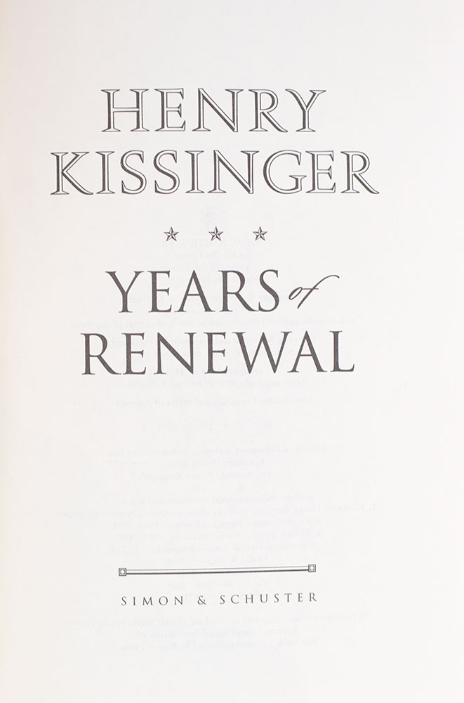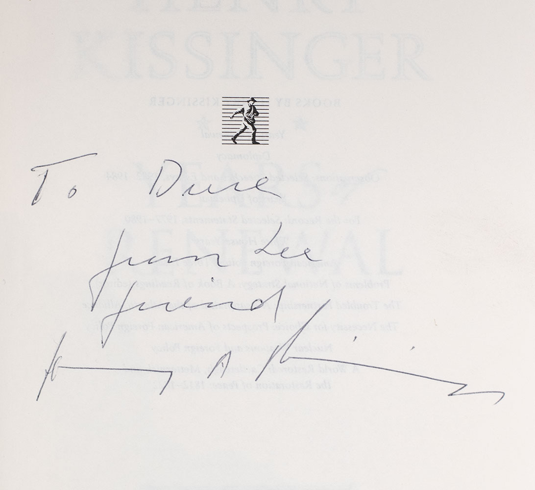 “It is not a matter of what is true that counts, but a matter of what is perceived to be true": First edition of Henry Kissinger's Years of Renewal; Inscribed by Him to Drue Heinz