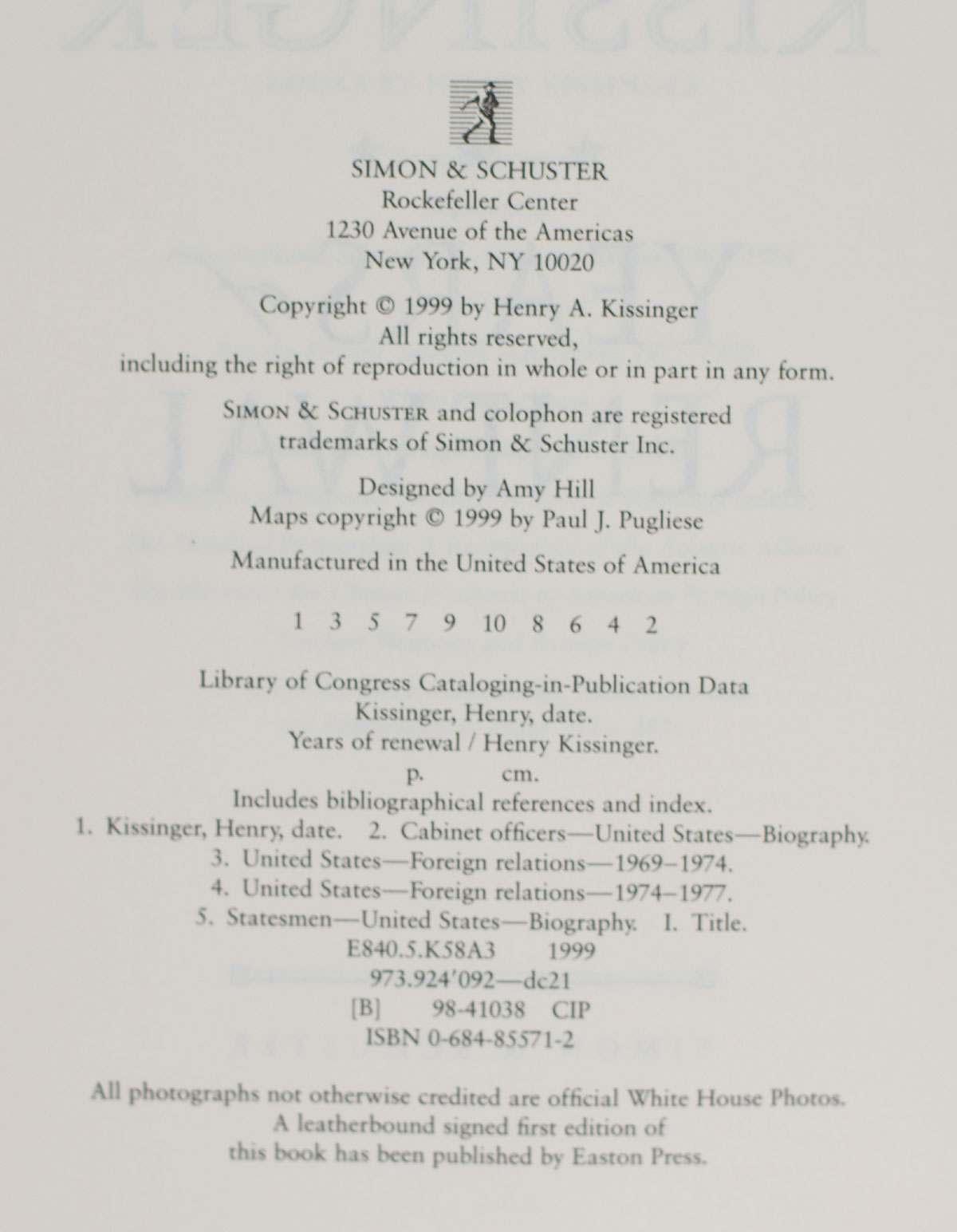 First edition of Henry Kissinger's Years of Renewal; Signed by Him