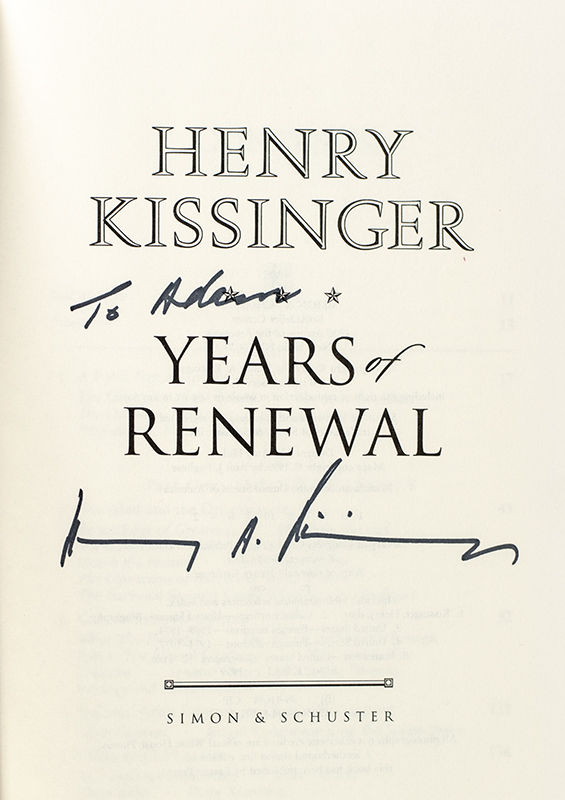 “It is not a matter of what is true that counts, but a matter of what is perceived to be true": First edition of Henry Kissinger's Years of Renewal; Signed by Him