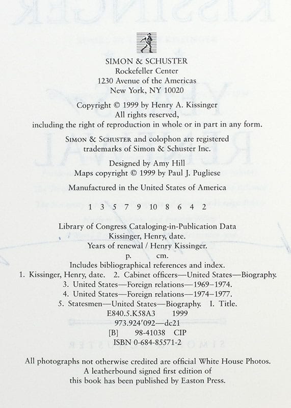 “It is not a matter of what is true that counts, but a matter of what is perceived to be true": First edition of Henry Kissinger's Years of Renewal; Signed by Him