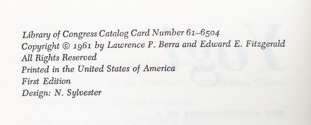 First edition of the autobiography of one of America's all-time baseball greats. Octavo, original cloth. Boldly signed by Yogi Berra on the front free endpaper. Near fine in a very good dust jacket. Jacket kodachrome by Hy Peksin. A very sharp example.