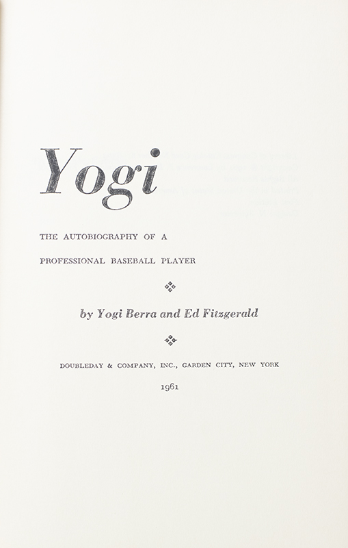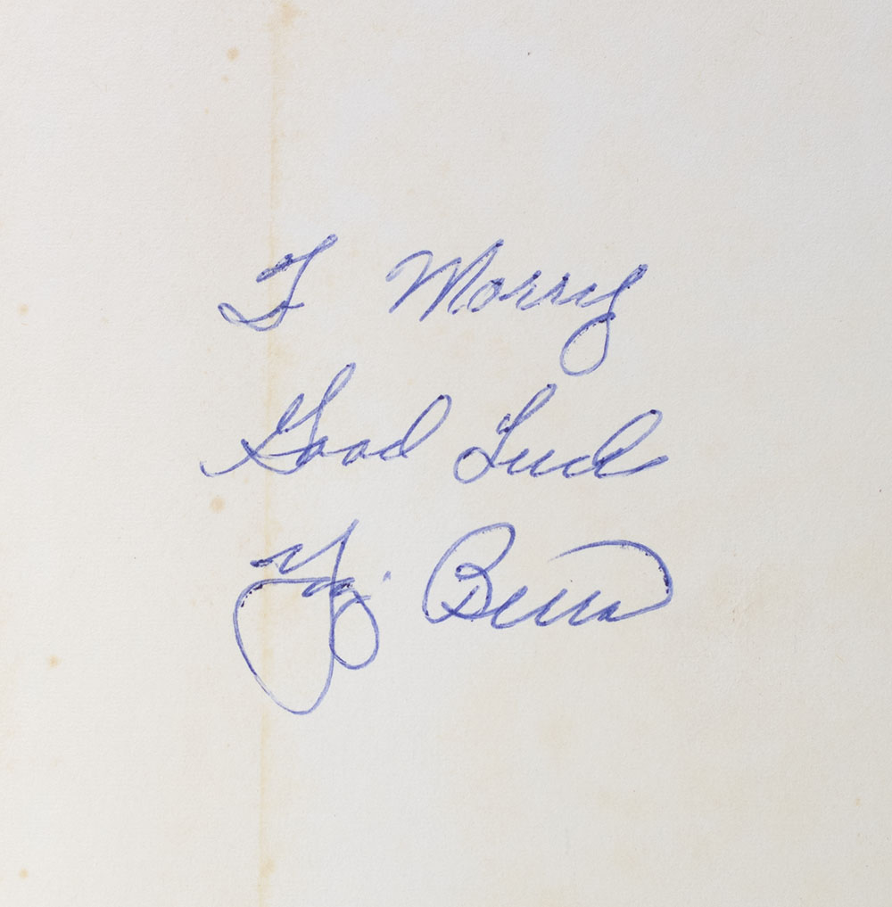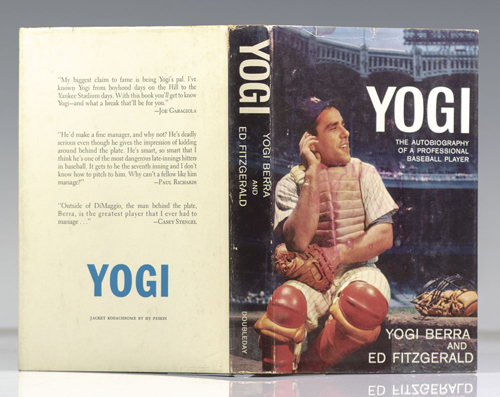 First edition of the autobiography of one of America's all-time baseball greats. Octavo, original cloth, illustrated. Presentation copy, inscribed by the author on the front free endpaper, "To Morry Good Luck Yogi Berra." Near fine in a near fine dust jacket. Jacket Kodachrome by Hy Peskin.