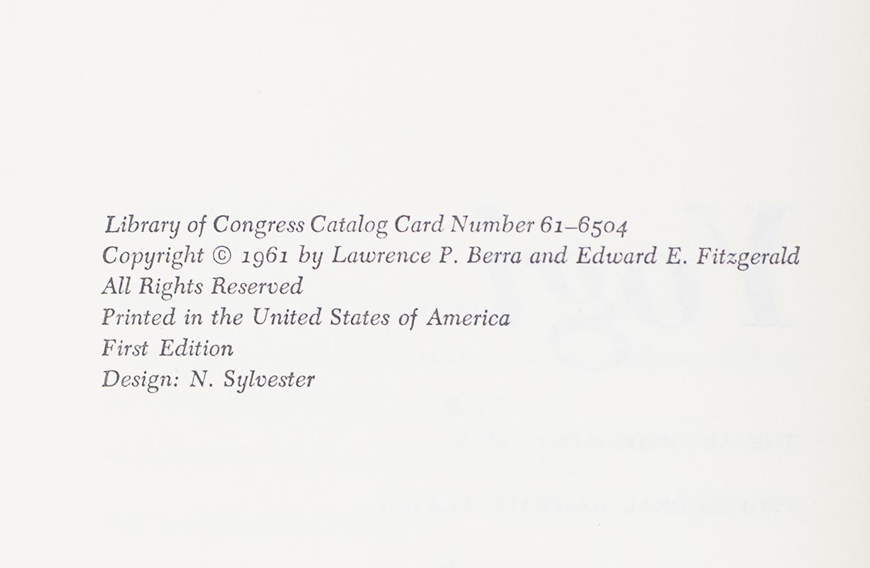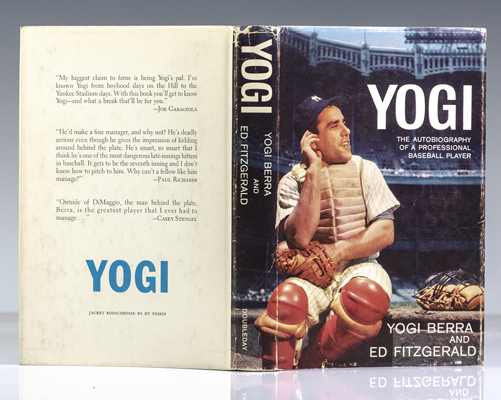 First edition of the autobiography of one of America's all-time baseball greats. Octavo, original cloth. Presentation copy, inscribed by the author on the front free endpaper, "To Bob Best Wishes Yogi Berra." Near fine in a near fine price-clipped dust jacket. Jacket Kodachrome by Hy Peskin.