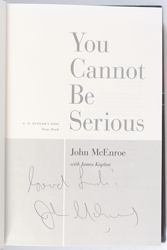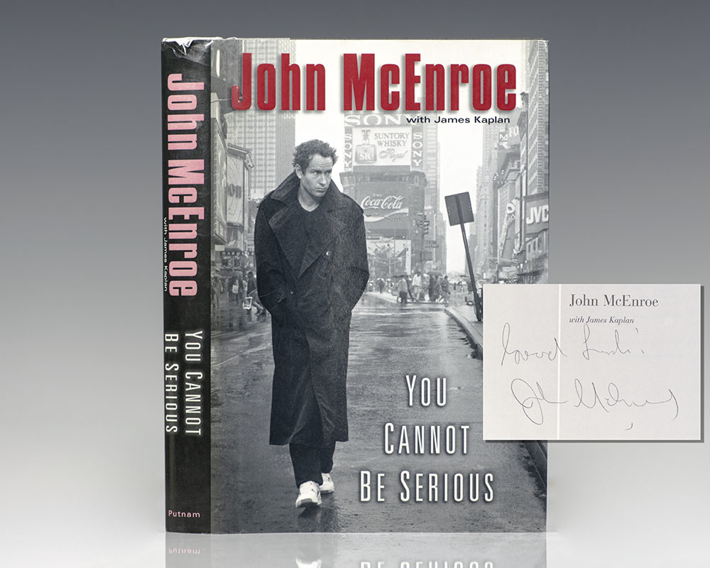 Early printing of the tennis champions autobiography. Octavo, original half cloth, illustrated. Signed by the author on the title page, "Good luck! John McEnroe." Near fine in a near fine dust jacket. Jacket design by Lisa Amoroso. Written with James Kaplan.
