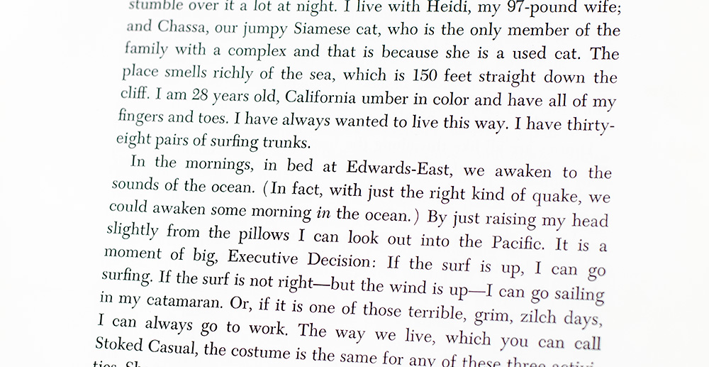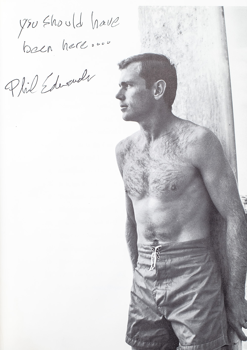 First edition of this classic profile of 'the surfer's surfer.' Octavo, original sky blue cloth, illustrated with full-page photographs. Lengthily signed by the author opposite the copyright page: "You should have been here .... Phil Edwards." Very good in a very good dust jacket, with dampstaining to the book. Jacket photograph by Lynn Pelham-Rapho-Guillumette. Photograph of Bob Ottum by Jerry Cooke.