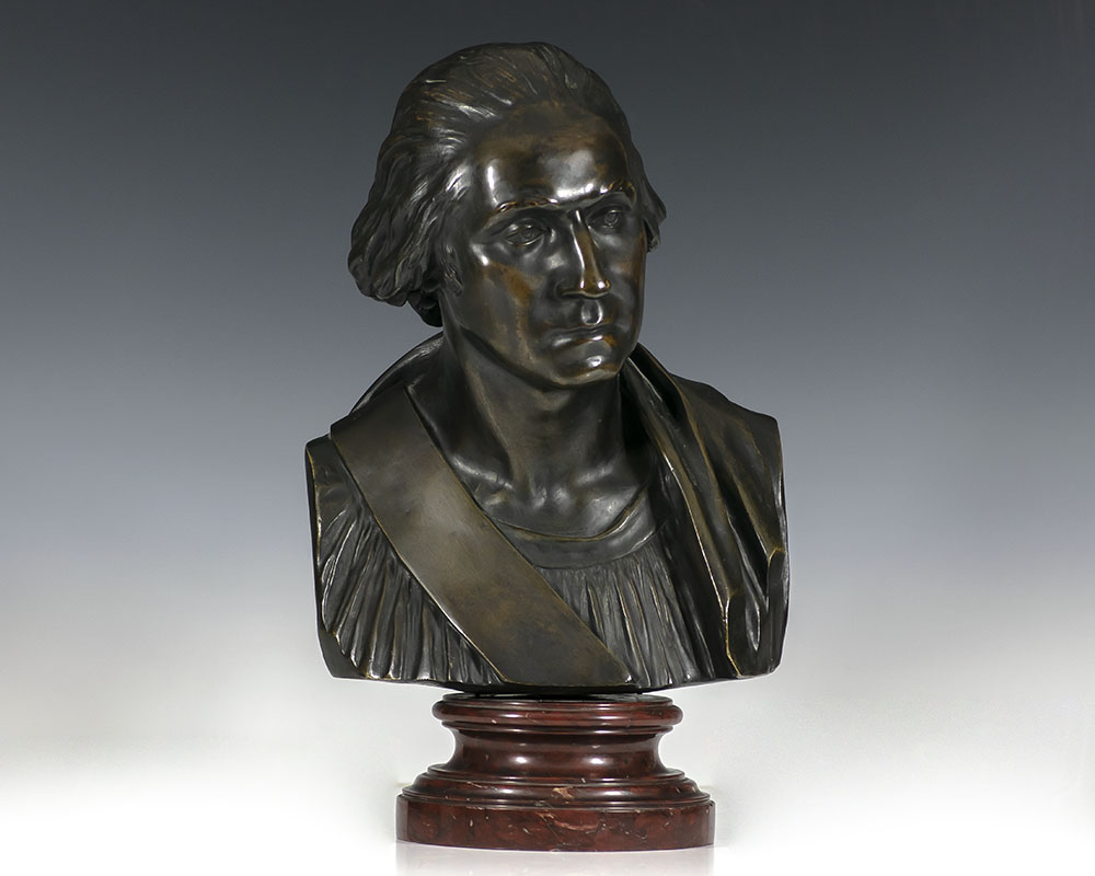 Fine bronze bust of George Washington, after the famed Houdon bust of 1785 which is considered the most accurate depiction of Washington. Bronze, mounted on a marble pedestal.