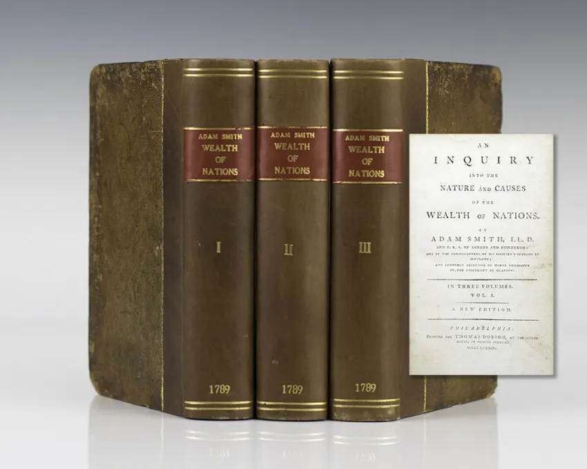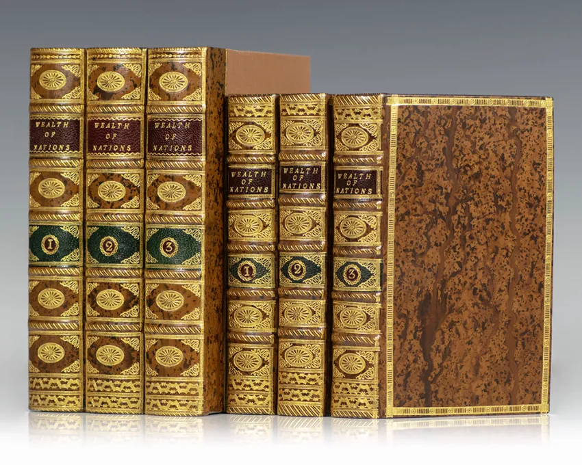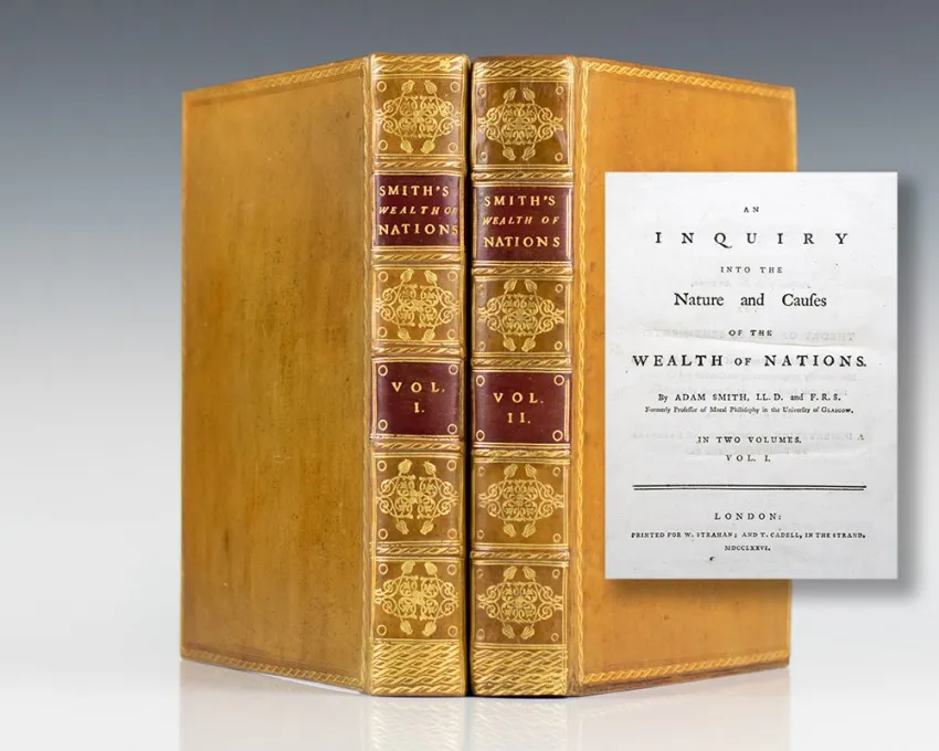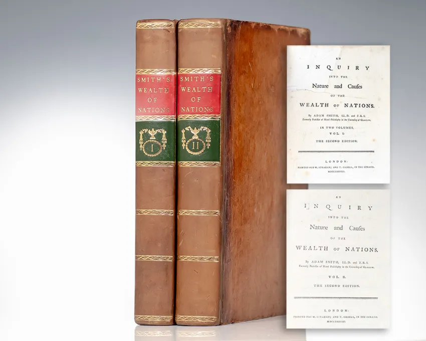 First edition of An Inquiry into the Nature and Causes of the Wealth of Nations by Adam Smith, his magnum opus and a cornerstone of economic thought.