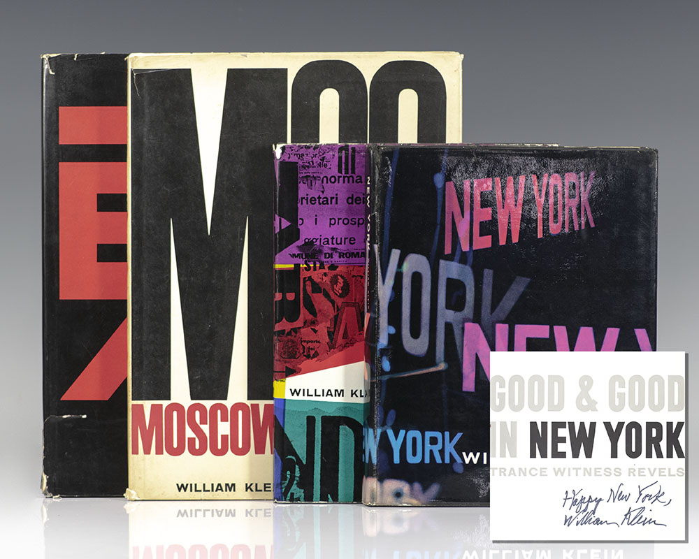 Klein’s style is best represented by his four city books, pictured above. Photographing Moscow, Tokyo, New York, and Rome, Klein’s books distinctively capture the heart of each city. The above set includes signed copies of each book, with the caption booklet of New York signed as well. Very good to near fine books in original dust jackets showing some light rubbing and wear.